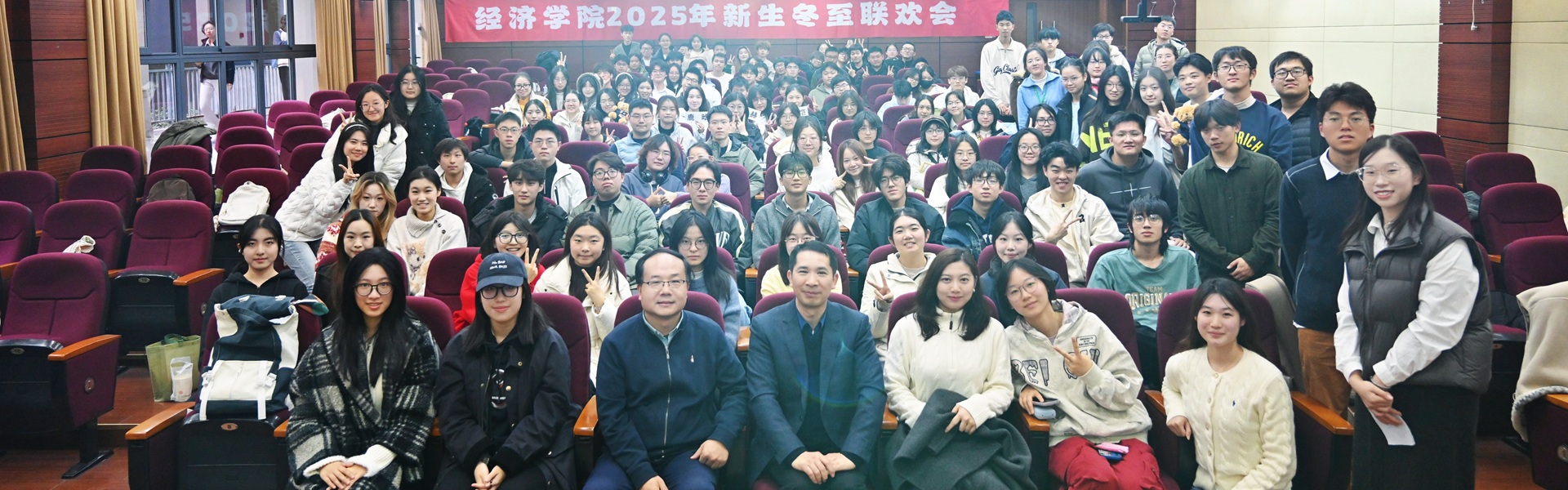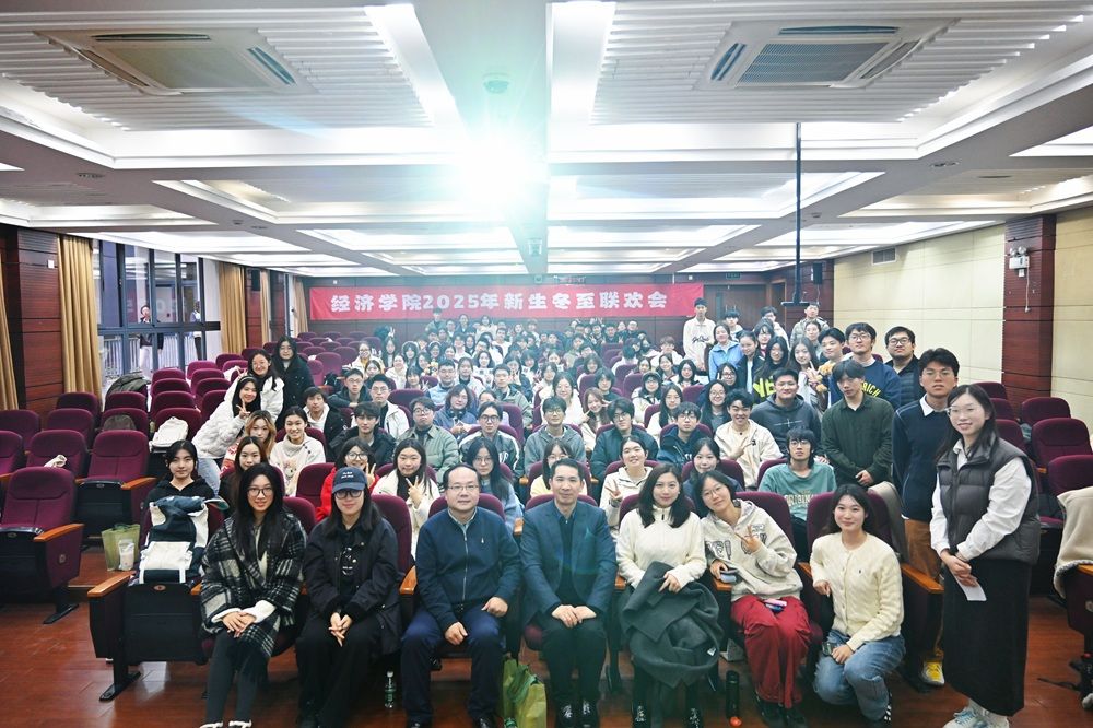 2025年12月19日下午,经济学院2025年新生冬至联欢会在宝山校区东区经管楼101楼蔡冠深讲堂举行。经济学院党委书记尹应凯,党委副书记、副院长冯玉鑫,本科生辅导员孙冰和全体2025级本科生新生欢聚一堂,共庆佳节。活动由2025级本科生黄安屹和惠嘉琦主持。活动伊始,现场已弥漫着浓厚的节日气息。同学们陆续到来,在精心设计的打卡点合影留念,并在“心愿板”上写下对学业与生活的美好期盼。一份份寓意吉祥的冬至小礼,传递着学院对学生们深深的祝福与关怀,...