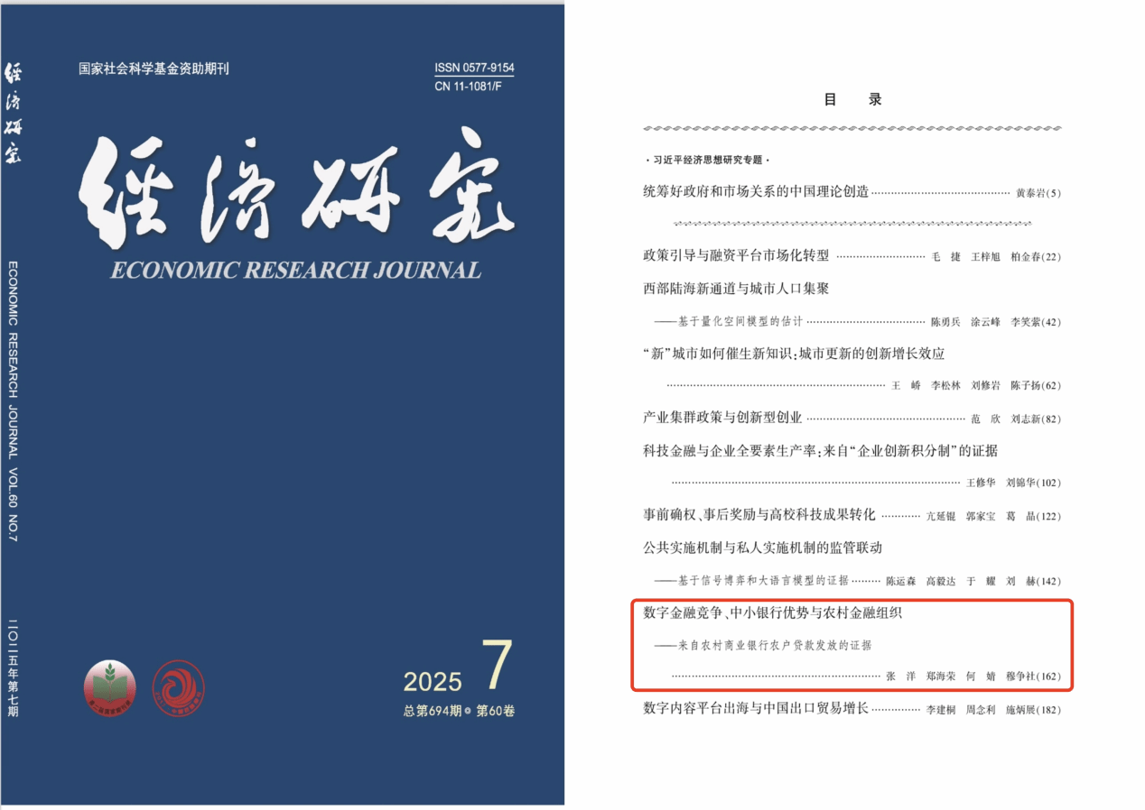 近日,经济学院青年教师张洋在数字金融领域的研究取得重要进展,研究成果《数字金融竞争、中小银行优势与农村金融组织——来自农村商业银行农户贷款发放的证据》在《经济研究》2025年第7期发表。此项研究旨在回应党的二十大报告提出的“健全农村金融服务体系”这一议题。数字金融发展对中小银行优势理论发起挑战,需重新审视大型银行与中小银行在农村金融组织体系中的角色与定位。在此背景下,该研究根据农户数字信息丰富度差异,将银行掌握的客户信息细分为传统型软信息、...综合新闻