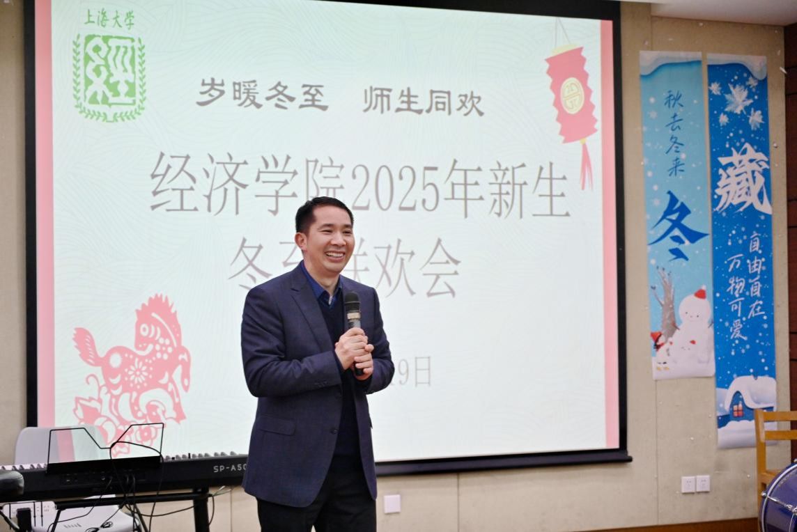 2025年12月19日下午,经济学院2025年新生冬至联欢会在宝山校区东区经管楼101楼蔡冠深讲堂举行。经济学院党委书记尹应凯,党委副书记、副院长冯玉鑫,本科生辅导员孙冰和全体2025级本科生新生欢聚一堂,共庆佳节。活动由2025级本科生黄安屹和惠嘉琦主持。 活动伊始,现场已弥漫着浓厚的节日气息。同学们陆续到来,在精心设计的打卡点合影留念,并在“心愿板”上写下对学业与生活的美好期盼。一份份寓意吉祥的冬至小礼,传递着学院对学生们深深的祝福与关怀,也为联欢会注入了首缕温情。 “明日一阳生百福,不辞相望阻寒宵”,冬至作为中国历史上最重要的节气之一,也是中华民族的一个传统节日。主持人首先从节气常识、冬至起源、冬至习俗、冬至诗歌四个方面对节令的文化内涵进行具体阐释,带领大家领略了冬至文化的深远意义。