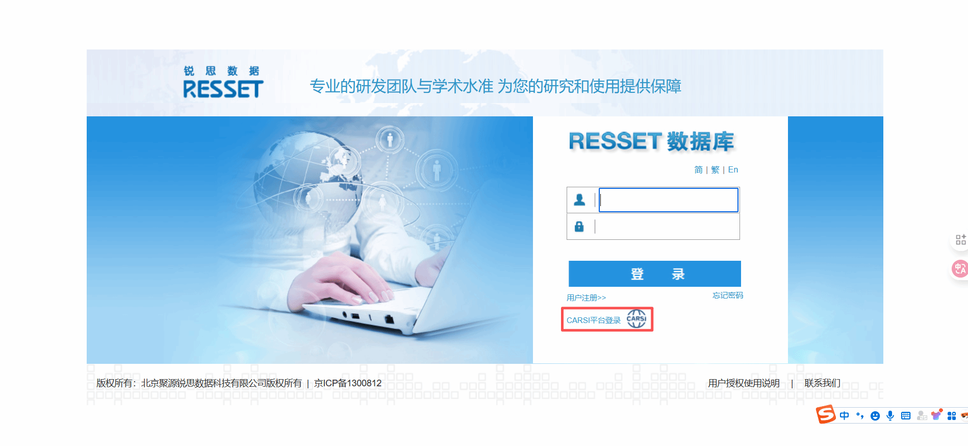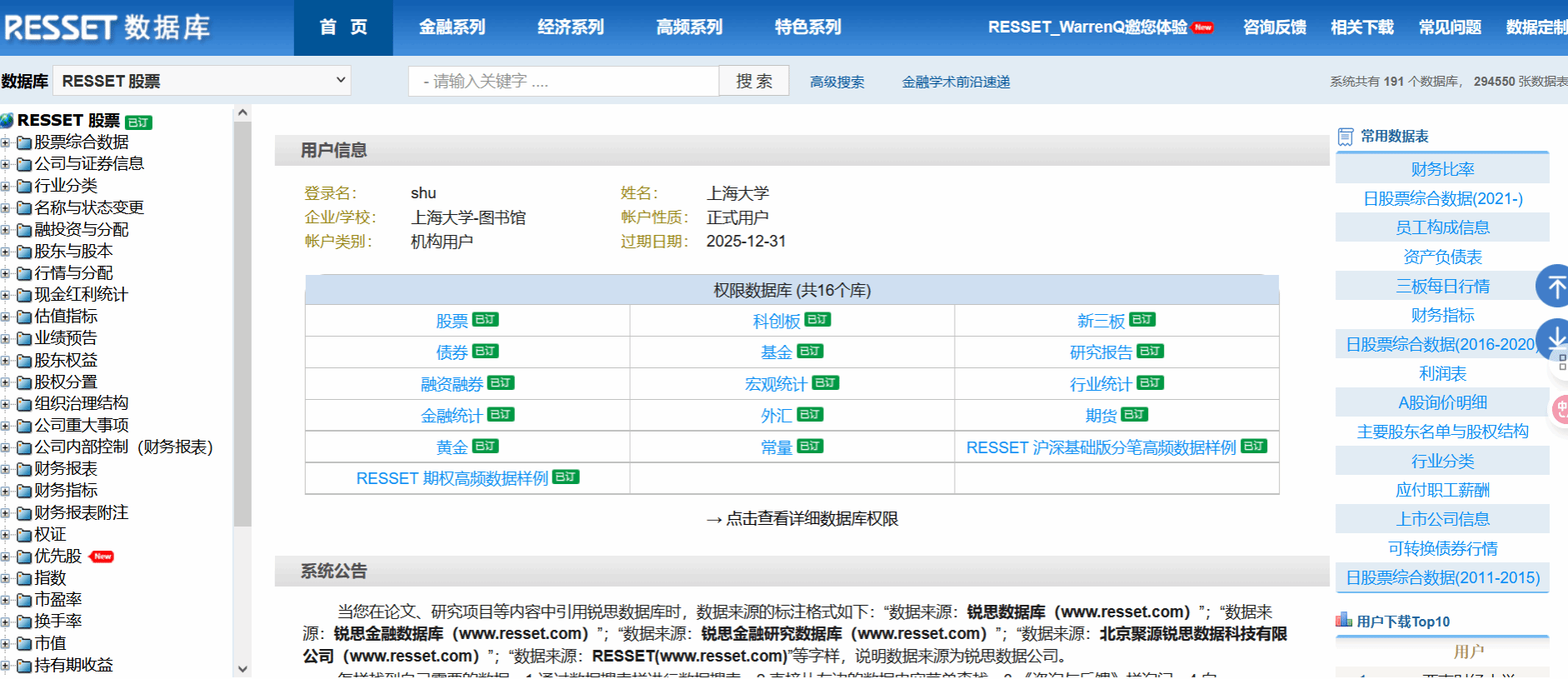 锐思RESSET金融研究数据库 【数据库简介】RESSET金融研究数据库历史数据完整、涵盖广泛,包括股票、新三板、科创板、债券、基金、研究报告、融资融券、宏观统计、行业统计、金融统计、外汇、期货、黄金等,并且研发团队与国内外著名高校合作计算了丰富的衍生指标。充分参照国际著名数据库的设计标准,又结合中国金融市场的实际情况,以实证研究为导向整体设计而成。为模型检验、投资研究、实证研究、学科与实验室建设等提供专业服务的数据平台。 【访问地址】https://db.resset.com/ 上海大学ip段内自动识别登录,如遇到无法识别,可点击CARSI平台登录选上海大学进入一卡通认证即可登录。