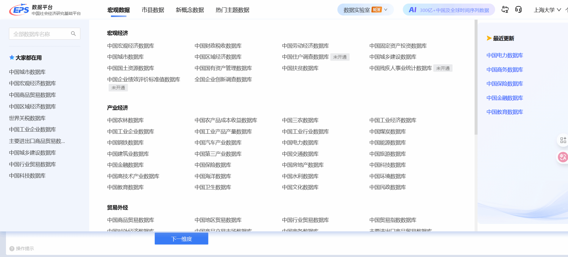 EPS中国社会经济研究基础数据平台 【数据库简介】EPS数据平台是集丰富的数值型数据资源和强大经济计量系统为一体的覆盖多学科、面向多领域的综合性统计数据与分析平台。平台涵盖宏观数据、市县数据、新概念数据和热门主题数据四大核心版块,包含150+个数据库,超过25亿条时间序列数据,数据总量超过300亿条,每年新增近20亿条。 【访问地址】https://olap.epsnet.com.cn/ 上海大学ip段内自动识别登录,经济学院师生也可通过已申请的个人账号进行登录访问。