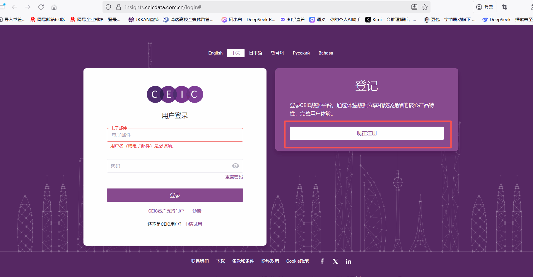 CEIC经济金融数据库 【数据库简介】CEIC 成立于 1992 年,由经济学家和分析师组成,提供有关世界发达经济和发展中经济的广泛、精确的信息。数据库覆盖 200 多个国家与地区的超过 660 万条时间序列数据,CEIC 有超过 2200 家数据来源,如,官方统计机构:国家统计局、国际基金货币组织、世界银行、经济合作与发展组织等;行业协会:世界钢铁协会,全球半导体联盟;金融信息提供商:道琼斯、标准普尔等。 【访问地址】https://insights.ceicdata.com.cn 上海大学ip段内点击“现在注册”,填写相关信息注册个人账号后即可登录使用。