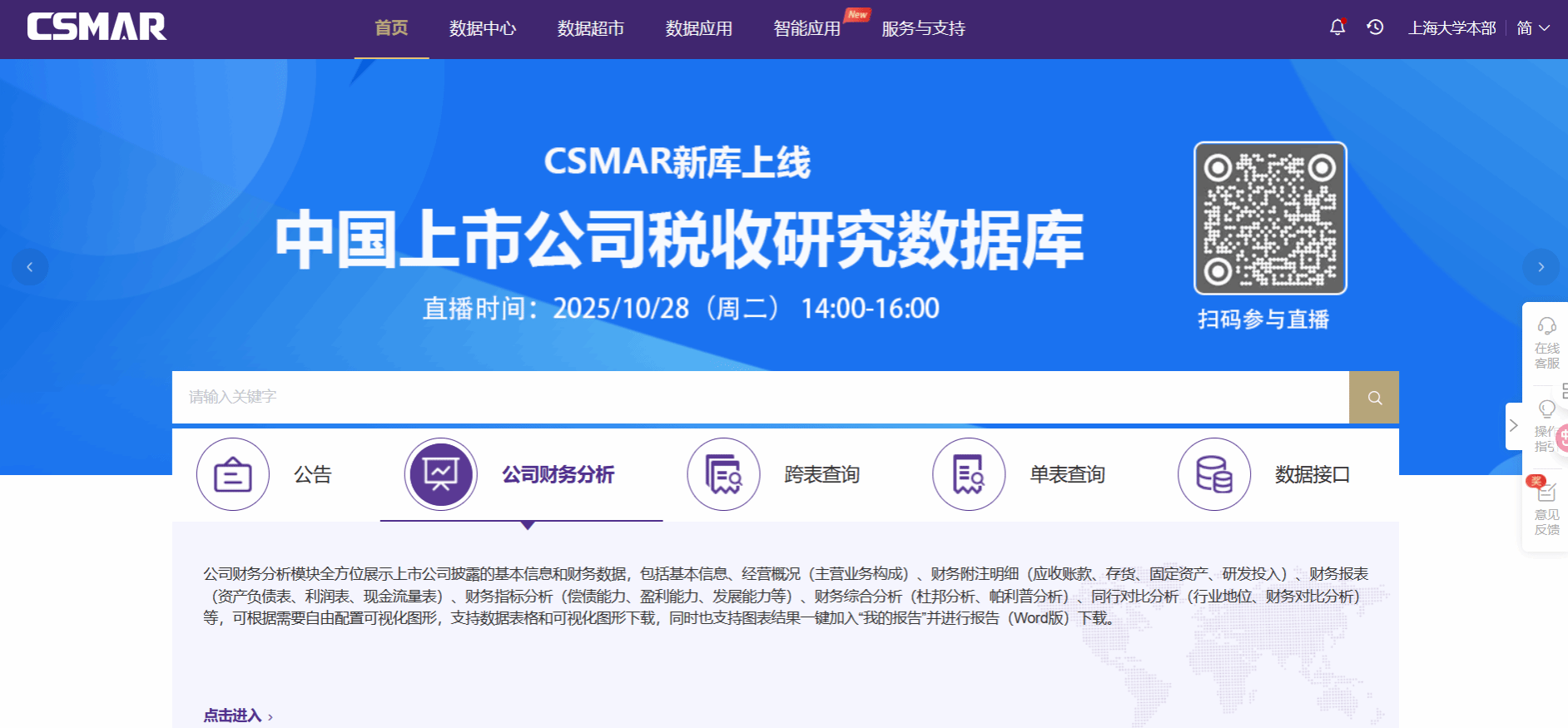 国泰安CSMAR中国经济金融研究数据库 【数据库简介】从学术研究的需求出发,借鉴芝加哥大学CRSP、标准普尔 Compustat、纽约交易所TAQ、I/B/E/S、Thomson等国际知名数据库的专业标准,并结合中国实际国情开发的经济金融型数据库。 涵盖中国证券、期货、外汇、宏观、行业等经济金融主要领域的高精准研究型数据库,是投资和实证研究的基础工具。 【访问地址】https://data.csmar.com/ 上海大学ip段内自动识别登录